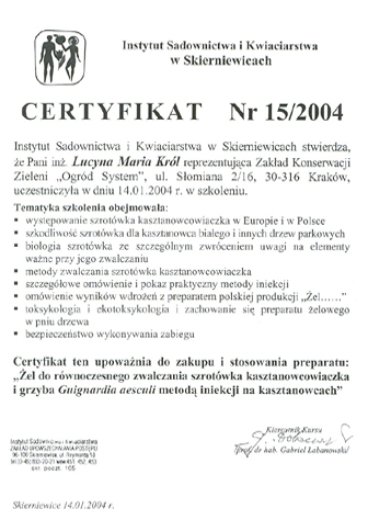 Certyfikat: Upoważnia do zakupu i stosowania preparatu: "Żel do równoczesnego zwalczania szrotówka kasztanowcowiaczka i grzyba Guignardia aesculi metodą iniekcji na kasztanowcach"